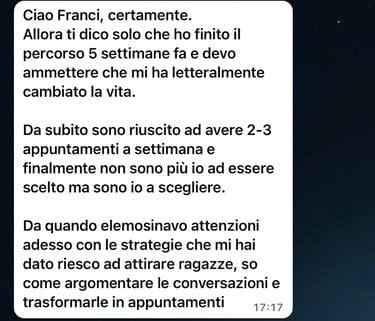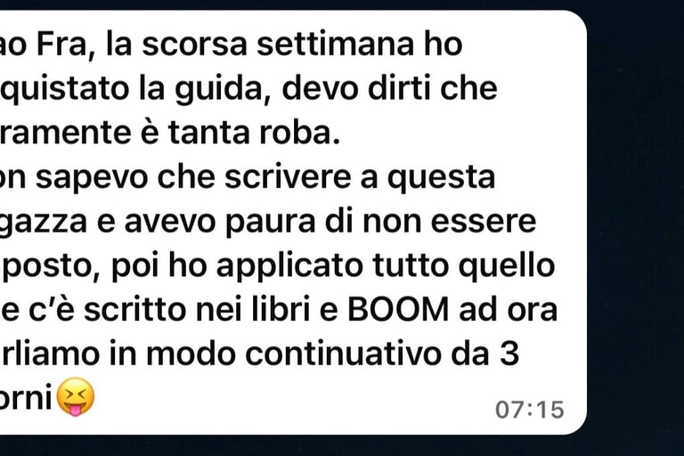 Sì. Questo metodo non si basa sull’aspetto o sul numero di follower. Ti insegna cosa dire, come dirlo e quando dirlo per farti notare e creare attrazione solo con i messaggi.